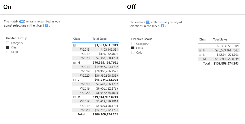 Jedna z najbardziej praktycznych zmian dotyczy field parameters w macierzach. Do tej pory, gdy zmienialiśmy parametr (np. miarę albo wymiar), macierz automatycznie zwijała się do najwyższego poziomu hierarchii, przez co traciło się kontekst analizy. Teraz Power BI zapamiętuje poziom, na którym pracujesz. Jeżeli więc jesteś na poziomie miesiąca i zmieniasz parametr, to po zmianie nadal zostajesz na poziomie miesiąca, a nie wracasz do roku. To domyślne zachowanie, ale Microsoft zostawił też opcję powrotu do starego trybu.