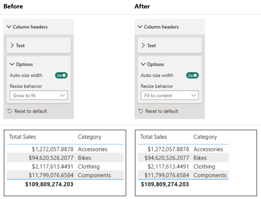 Po zgłoszeniach użytkowników Power BI zmienił domyślne działanie dopasowania szerokości kolumn — teraz kolumny są ustawiane domyślnie względem zawartości, a nie rozciągane na całą szerokość wizualizacji.