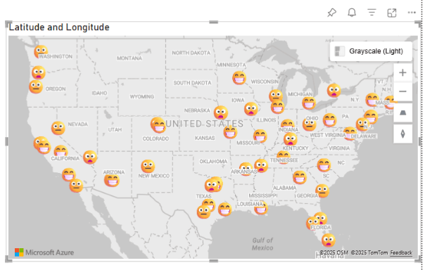 W wizualizacji Azure Maps pojawiła się obsługa markerów, czyli ikon, które mogą reprezentować dane punkty z kontekstem. Możesz ustawić różne ikony, kolory i rozmiary markerów w zależności od danych, co pomaga lepiej opowiedzieć historię geograficzną.